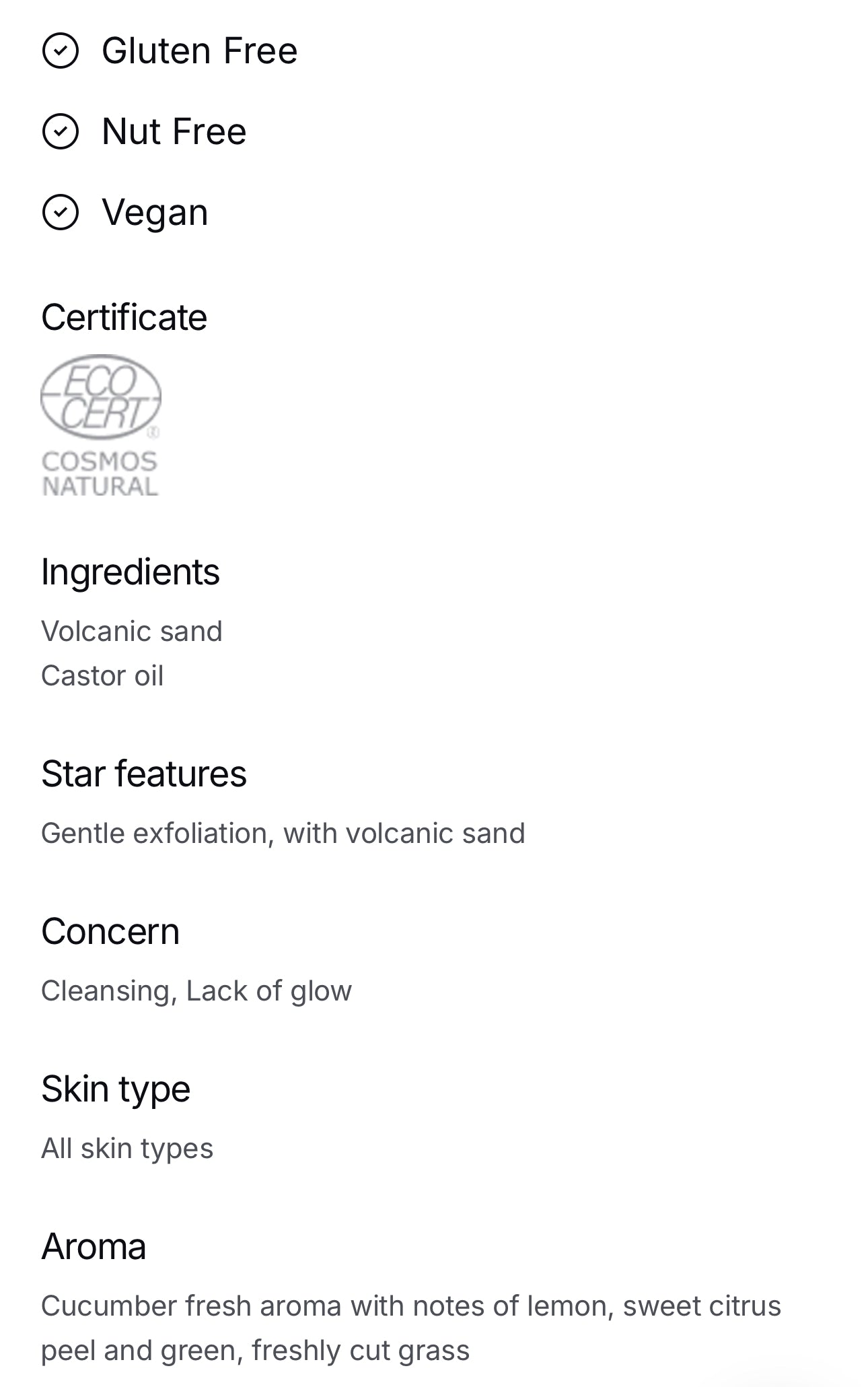 Aqua/Water, Hydrogenated Castor Oil, Cetearyl Alcohol, Caprylic/Capric Triglyceride, Pentylene Glycol, Glycerin➁, Glyceryl Stearate Citrate, Polyglyceryl-3 Stearate, Kaolin, Volcanic Sand, Parfum/Fragrance, Helianthus Annuus (Sunflower) Seed Oil➀, Xanthan Gum, Vaccinium Myrtillus (Blueberry) Fruit Extract➀, Tocopherol, Fragaria Ananassa (Strawberry) Fruit Extract➀, Rubus Chamaemorus (Cloudberry) Fruit Extract➀, Rubus Idaeus (Raspberry) Fruit Extract➀, Sodium Phytate, Lactic Acid, Citric Acid, Sodium Benzoate, Potassium Sorbate, Benzyl Salicylate➂, Limonene➂, Citrus Aurantium Peel Oil, Citral➂